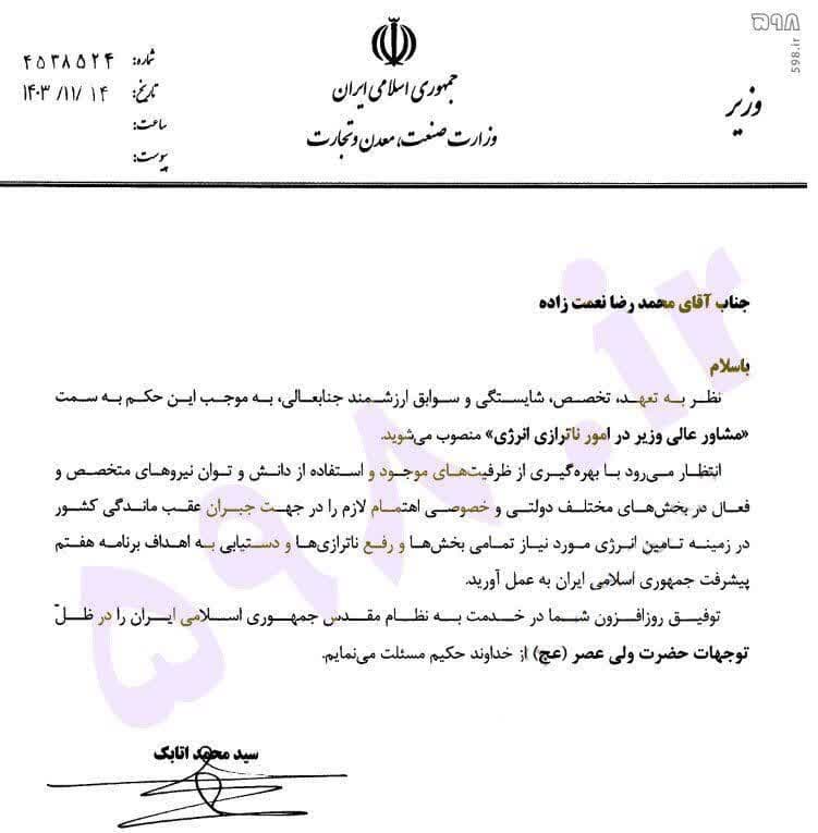 در اقدامی عجیب ، محمدرضا نعمتزاده ۸۰ساله، وزیر پیشین صنعت، به عنوان مشاور عالی امور ناترازی انرژی در وزارت صمت منصوب شد. این انتصاب در شرایطی صورت گرفته که حل بحران انرژی ایران نیازمند ایدههای نو و مدیریت جوانترهاست.
