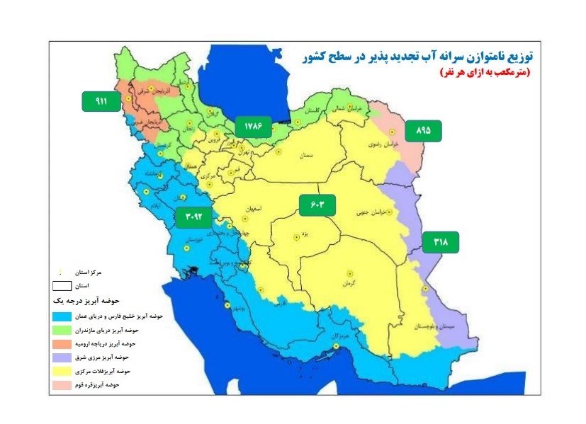 سرانه آب تجدیدشونده کشور نشاندهنده درگیر بودن ایران با تنش آبی است. نکته حائز اهمیت این است که این سرانه نیز به طور متوازن و یکسان در نقاط مختلف کشور تقسیم نشده و برخی از نقاط کشور، تنش آبی شدیدتری را تجربه میکنند و برخی از نقاط کشور از مرحله تنش آبی عبور کرده و وارد مرحله فقر آبی شدهاند.
