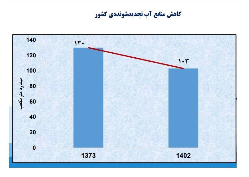 منابع آبی تجدیدشونده ایران در 30 سال گذشته از 130 میلیارد مترمکعب در سال به حدود 100 میلیارد مترمکعب کاهش یافته و بهعبارتی، این کاهش منابع آب تجدیدشونده، بهطور متوسط سالانه حدود یکمیلیارد مترمکعب بوده که رقم بسیار بزرگی است.