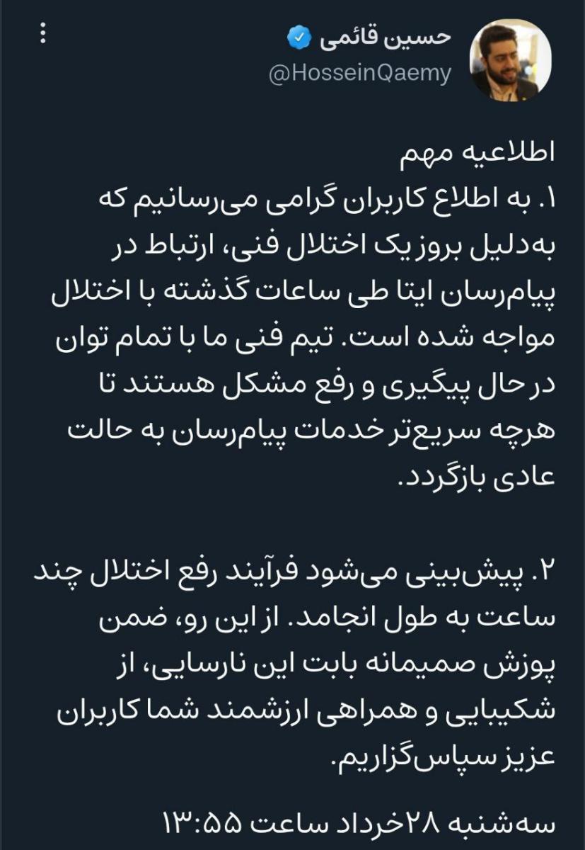 اطلاعیه ایتا درباره اختلال