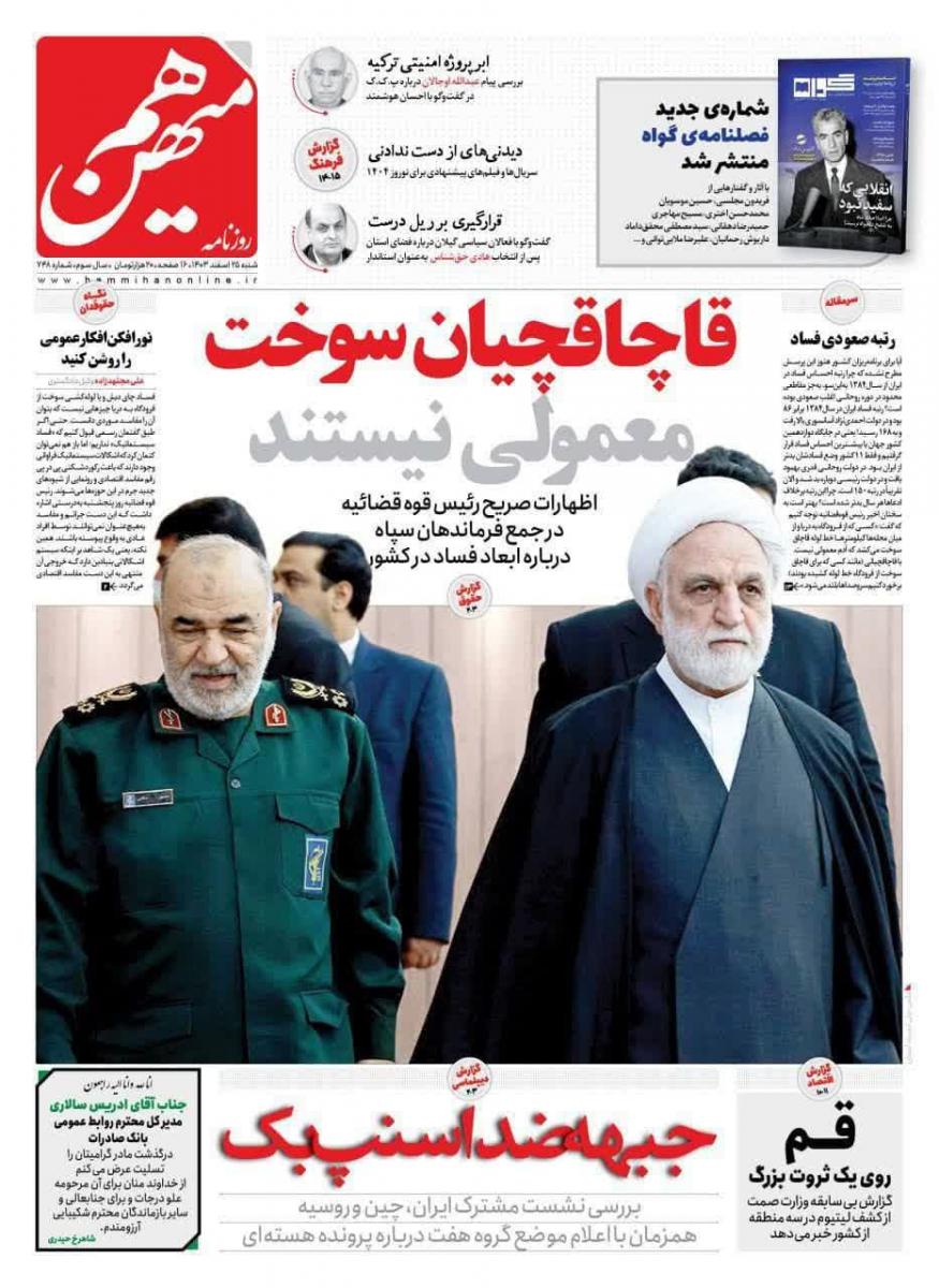 «هممیهن» سخنان رئیس قوه قضائیه مبنی بر «قاچاقچیان سوخت معمولی نیستند» را با تصویری معنادار از سردار سلامی به تیتر و عکس یک خود تبدیل کرد تا به مخاطب اینگونه القا کند که سپاه پاسداران پشت پرده قاچاق سوخت است.