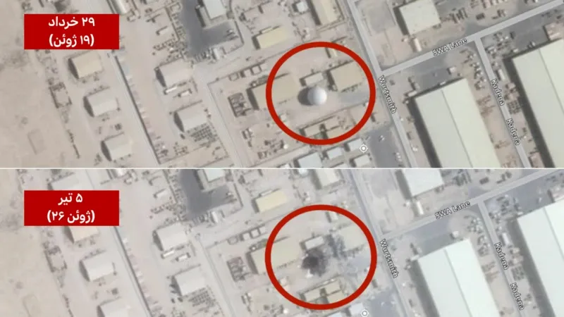 مقایسه تصاویر ماهوارهای قبل و بعد از حمله ایران به پایگاه العدید در قطر نشان میدهد که یک آنتنپوش در اثر اصابت یک موشک بالستیک ایران به شدت تخریب شده است.