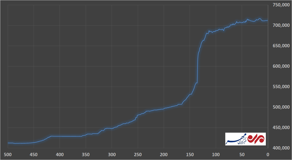 نمودار زیر روند افزایش قیمت اسکناس دلار آمریکا را در ۵۰۰ روز کاری (از مرداد ۱۴۰۲ تا به امروز) نشان میدهد. در این مدت افزایش قیمت اسکناس دلار از ۴۱۲,۹۹۷ ریال تا ۷۱۴,۸۴۷ ریال بیانگر رشد بیش از ۷۲ درصدی (نزدیک به ۳۰ هزار تومانی) در این مدت است.