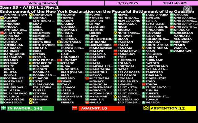 این مجمع، با ۱۴۲ رأی موافق در برابر ۱۰ رأی مخالف و ۱۲ رأی ممتنع، طرح قطعنامهای را تصویب کرد که از بیانیه نیویورک در حمایت از تشکیل یک دولت فلسطینی مستقل و از اجرای راهحل دو کشوری حمایت میکند.