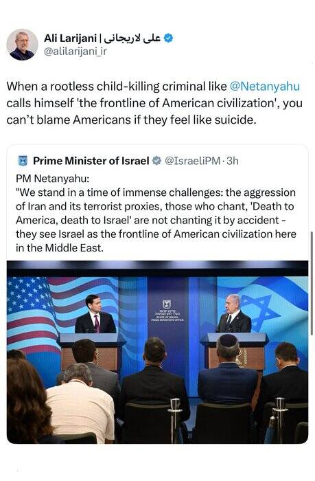 علی لاریجانی دبیر شورای عالی امنیت جمهوری اسلامی ایران نیز در پاسخ به نخست وزیر رژیم صهیونیستی، در رسانه های اجتماعی ایکس نوشت: «با این حرف نتانیاهو اگر ملت آمریکا خودکشی کنند حق دارند که یک جنایتکارِ بیهویتِ کودککش خود را خط مقدم تمدن آنها معرفی میکند.»