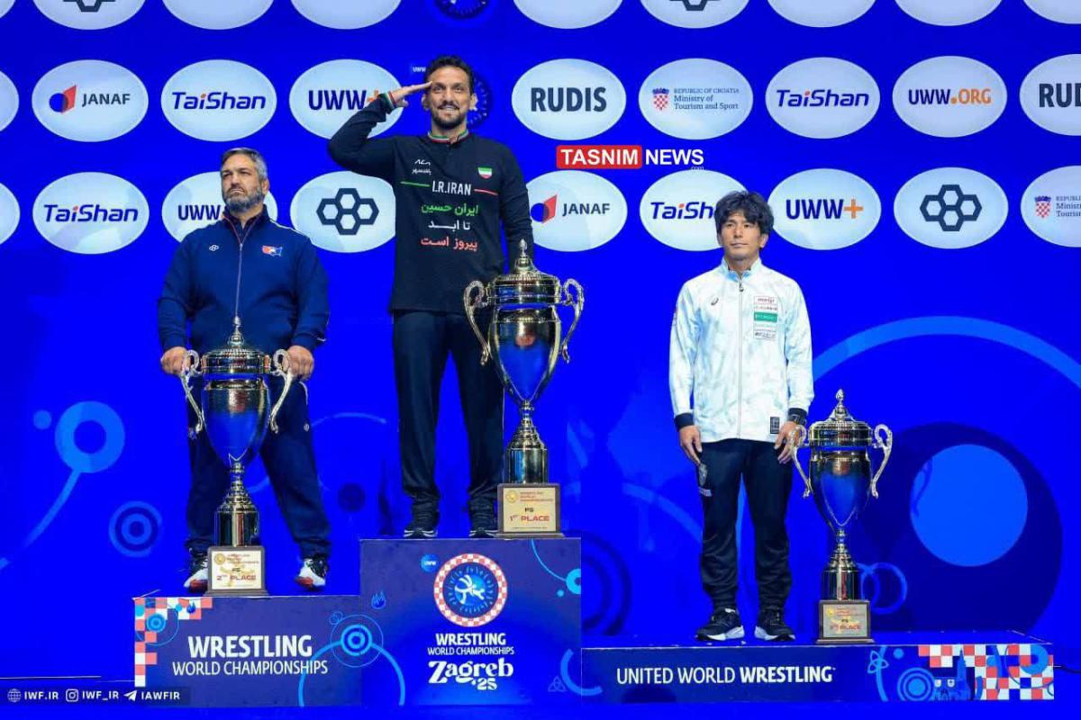 سرمربی تیم ملی کشتی آزاد ایران با جمله «ایران حسین تا ابد پیروز است» و با سلام نظامی روی سکوی قهرمانی ایستاد.