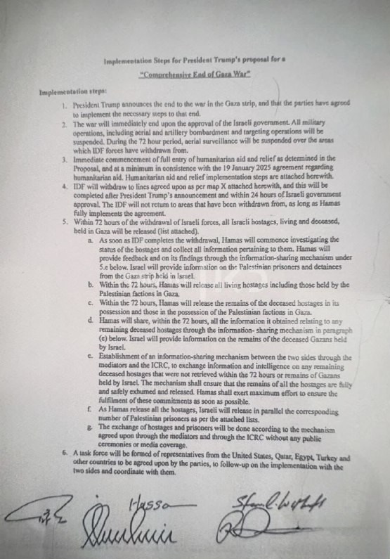 1. رئیس جمهور ترامپ پایان جنگ در نوار غزه را اعلام میکند و طرفین توافق کردهاند که گامهای لازم را برای این منظور بردارند.
