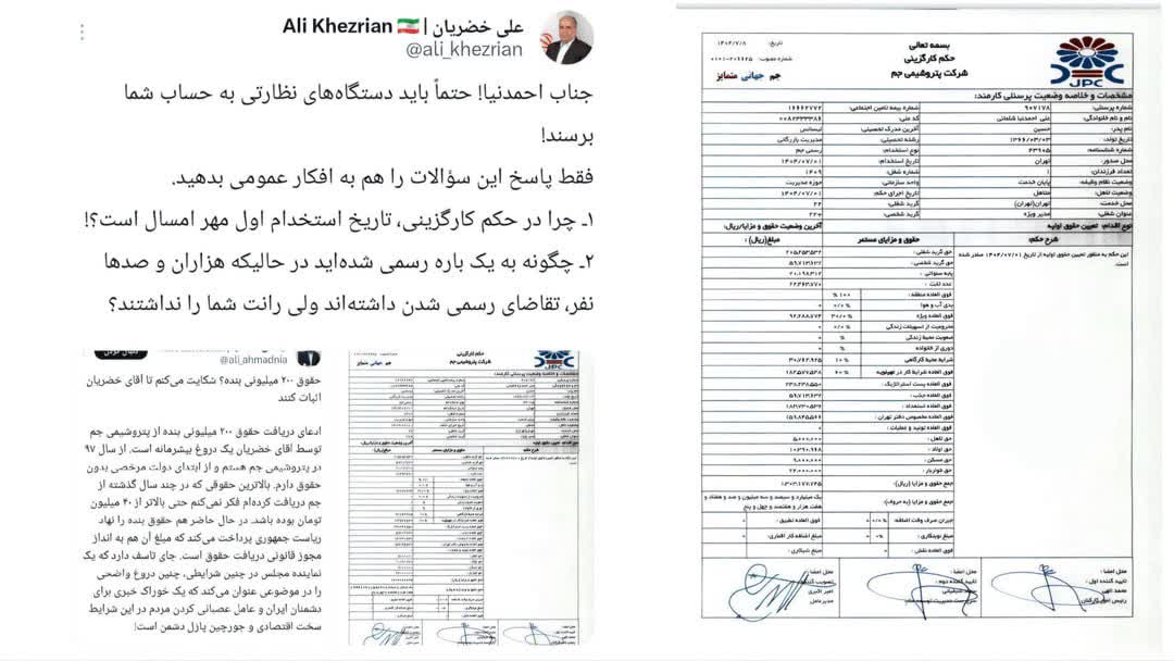 خضریان در واکنش به توضیحات احمدنیا، حکم کارگزینی او در شرکت پتروشیمی جم را در پاسخ به تکذیبیۀ او منتشر کرد.