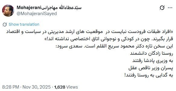 به هر کسی نباید اجازه داد که بیاید و وزیر افتصاد شود. وزیر خارجه شود. نماینده مجلس شود. طبقه متوسط است که آینده این کشور را رقم می زند."