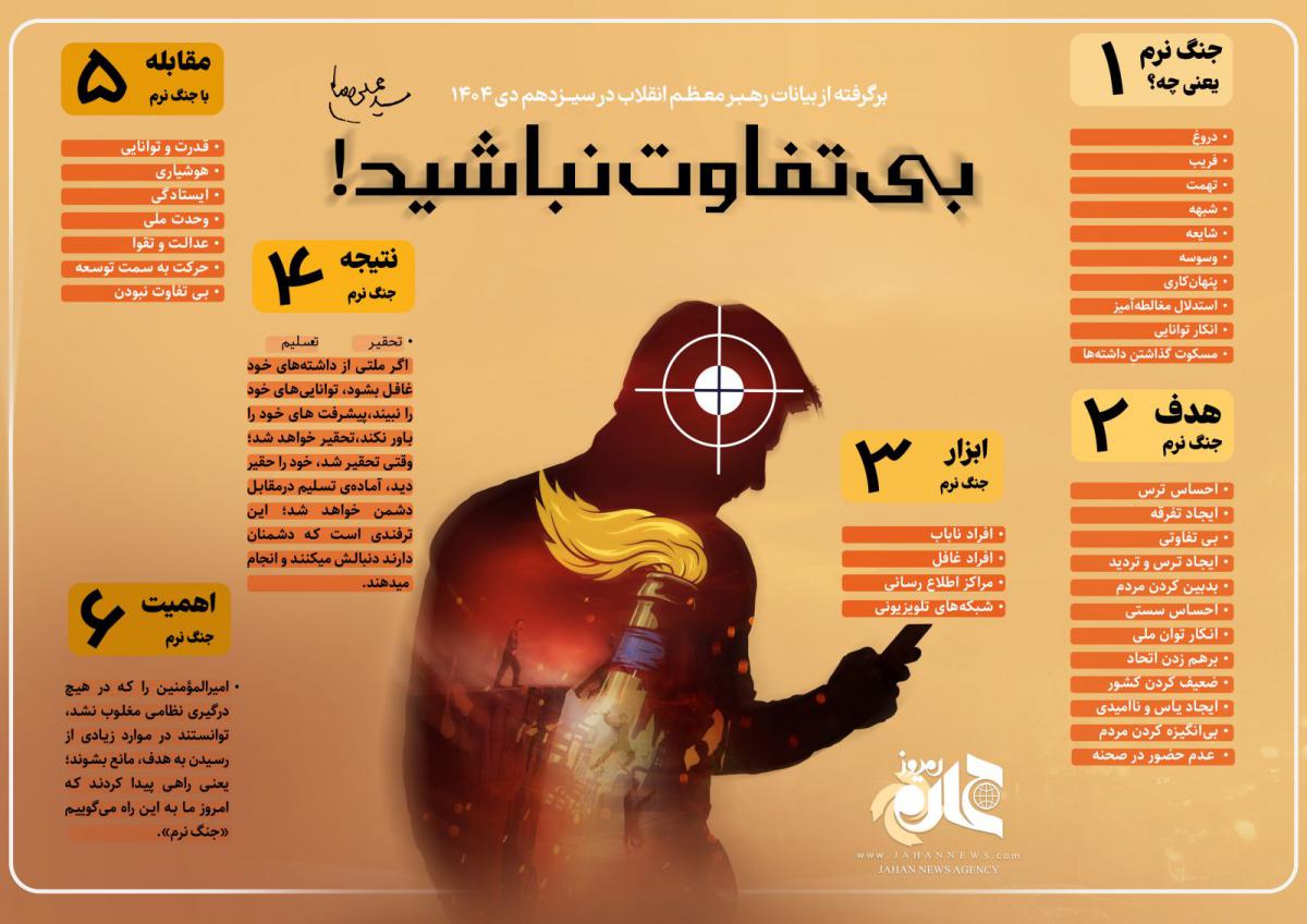رهبر انقلاب: امیرالمؤمنین را که در هیچ درگیری نظامی مغلوب نشد، توانستند در موارد زیادی از رسیدن به هدف، مانع بشوند؛ یعنی راهی پیدا کردند که امروز ما به این راه میگوییم «جنگ نرم».