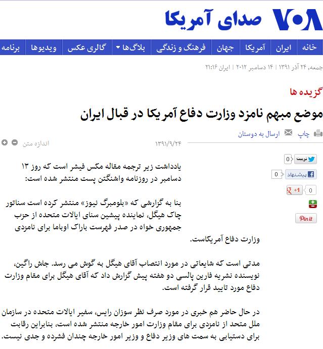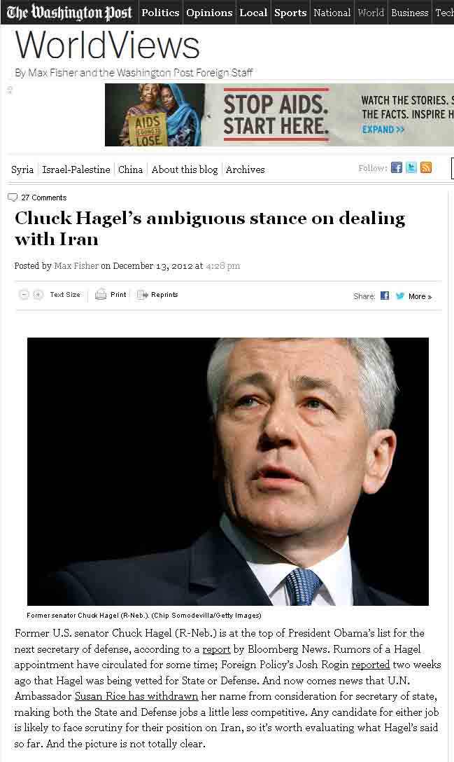 نام آقای هیگل امسال در یکی از سرمقاله های واشنگتن پست در کنار چهار نویسنده دیگر بود که حمله نظامی (به ایران) را یک گزینه قابل پذیرش خوانده بودند. اما من از زمانی که دوره ریاست جمهوری بوش به پایان رسیده است هنوز نتوانسته ام اظهارنظرهای روشنی از هیگل در حمایت و یا مخالفت از حمله نظامی بیابم.