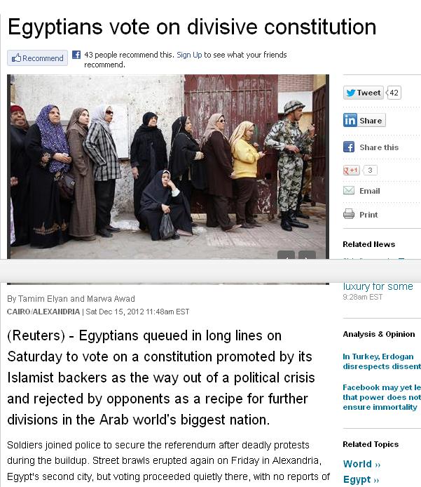 رویترز همچنین نوشت: سربازان مصری نیز برای تضمین امنیت برگزاری همه پرسی پس از اعتراض های مرگبار اخیر، به نیروهای پلیس این کشور ملحق شده اند و درحال حاضر هیچ گزارشی درمورد خشونت منتشر نشده است.