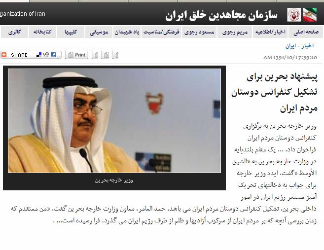 به نوشته "الشرق الاوسط"، شیخ خالد بن احمد آل خلیفه، وزیر خارجه بحرین، در این رابطه در صفحه "توئیتر" خود نوشته: «وقت آن رسیده که شاهد کنفرانس "دوستان مردم ایران" باشیم.»!!!
