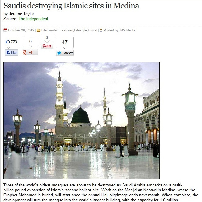 روزنامه «ایندیپندنت» در این زمینه نوشته است: تخریب بخشهای مهمی از مکان مقدس و تاریخی مسلمانان در مدینة النبی از ماه آینده میلادی آغاز میشود. سعودیها مدعی شدهاند که به بهانه توسعه مسجد النبی اقدام به این کار میکنند، اما ادامه ساخت و سازهای بیرویه و میلیاردی سعودیها این نگرانی را در میان مسلمانان بوجود آورده است که آنان آثار تاریخی و فرهنگی اسلام را به بولدوزرها میسپارند. خشم مسلمانان از اقدامات سعودیها در قبال مقدسترین اماکن مذهبی مسلمانان از زمان ساخت برج ساعت در کنار مسجدالحرام اوج گرفت که توهینی آشکار به مقدسات اسلامی به شمار میرود.