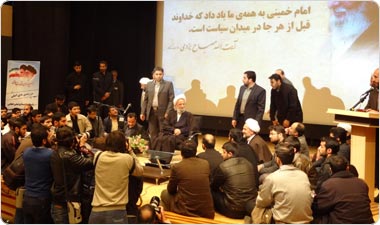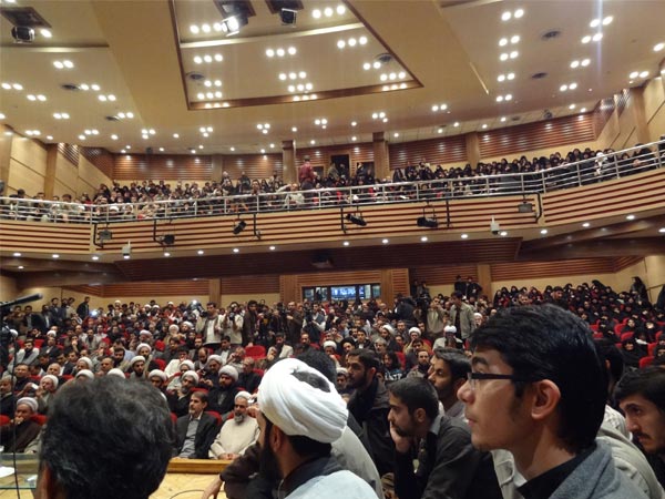 - رفته رفته به قدري جمعيت زياد شد كه جوانان علاقه مند دور زمين سالن و حتي قسمت محل سخنراني در كنار سخنران نيز نشستند، به گونه اي كه حتي حجت الاسلام قاسم روانبخش عضو شوراي مركزي جبهه پايداري نيز به علت كمبود جا، مجبور شد، در اين قسمت بنشيند.