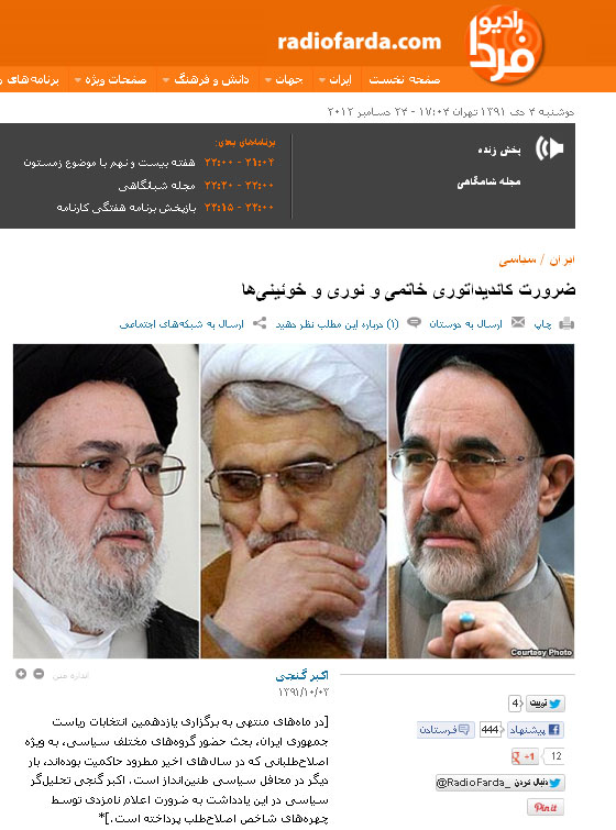 اکبر گنجی طی مقاله ای با عنوان "ضرورت کاندیداتوری خاتمی و نوری و خوئینیها " در وب سایت "رادیو فردا" (radiofarda) نسبت به حذف اصلاح طلبان از حوزه سیاسی ایران هشدار داده و می نویسد: «نسشتن به این امید که اتفاقی بیفتد، ۳۳ سال است که عده زیادی را گرفتار توهمات ایدئولوژیک کرده است. همه به یاد داریم که در اوایل دوران اصلاحات سردبیر یکی از روزنامهها میگفت، اگر روزنامه ما را ببندند، ۷۰۰ هزار نفر فقط در تهران تظاهرات برپا خواهند کرد. روزنامهشان را بستند و خودشان را زندانی کردند، اما پنج تن هم به اعتراض خیابانی برنخواستند... اصلاحطلبان اگر قصد ورود و اصلاح نظام را دارند، تنها راه ورود، نامزدی در انتخابات است.»