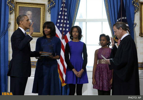 اوباما در مراسم تحلیف رسمی با سوگند به انجیل خانوادگی میشل اوباما، بانوی اول آمریکا دومین دوره ریاستجمهوری خود را به طور رسمی آغاز کرد. این در حالی است که مراسم عمومی تحلیف امروز (دوشنبه) در مقابل کنگره آمریکا در واشنگتن و با حضور مردم تکرار خواهد شد.