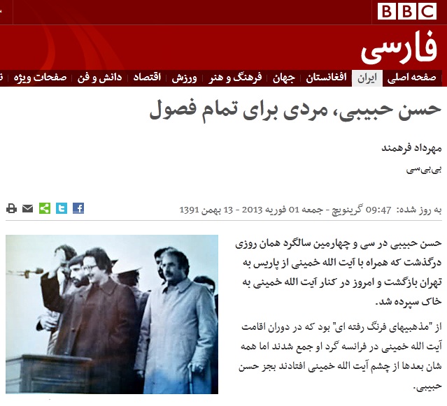 «حسن حبیبی در سی و چهارمین سالگرد همان روزی درگذشت که همراه با آیت الله خمینی از پاریس به تهران بازگشت و امروز در کنار آیت الله خمینی به خاک سپرده شد. از "مذهبی های فرنگ رفته" ای بود که در دوران اقامت آیت الله خمینی در فرانسه گرد او جمع شدند، اما همه شان بعدها از چشم آیت الله خمینی افتادند به جز حسن حبیبی.»