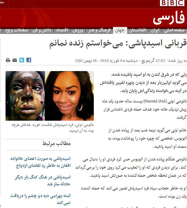 در ابتدا بی بی سی برای توصیف شخصی که خانم نائومی را با پاشیدن اسید مصدوم ساخته، می آورد: "خانم اونی میگوید نیمه شب بعد از پیاده شدن از اتوبوس، شخصی که چهره خود را پوشانده بوده، به سمت او اسید پاشید."