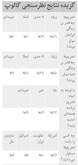 مؤسسه گالوپ این نظرسنجی را از میان هزار ایرانی بالای پانزده سال انجام داده است و بر اساس آن، با وجود اینکه اکثر ایرانیان تحریم ها را در زندگیشان مؤثر دانسته اند؛ اما 63% بر ادامه برنامه هسته ای ایران تأکید کرده اند و 47% آمریکا را مقصر تحریم ها شناخته اند.