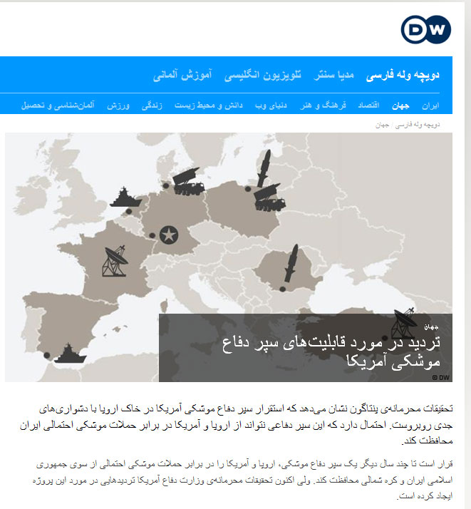 در این گزارش که وب سایت دویچه وله آلمان (DW) آن را ترجمه و منتشر کرده، آمده است: «تحقیقات محرمانهی پنتاگون نشان میدهد که استقرار سپر دفاع موشکی آمریکا در خاک اروپا با دشواریهای جدی روبروست. احتمال دارد که این سپر دفاعی نتواند از اروپا و آمریکا در برابر حملات موشکی احتمالی ایران محافظت کند.