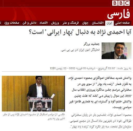 ««واکنش شدید مخالفان اصولگرای محمود احمدی نژاد به تکرار شعار "زنده باد بهار" از سوی وی در سخنرانی مراسم جشن سالگرد پیروزی انقلاب سال 1357، این سؤال را پیش می کشد که علت چنین واکنش خشم آلود و گسترده ای به شعاری ظاهرا غیرسیاسی چیست؟