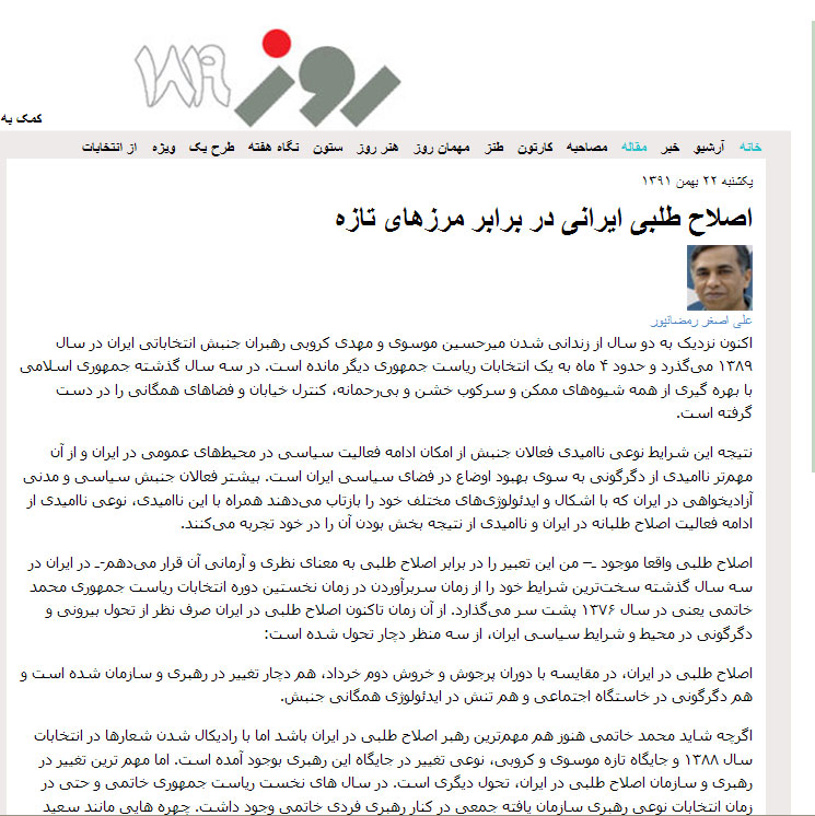 وی با بیان اینکه "در شرایط کنونی به نظر می رسد از آن گستردگی نفوذ و عمق اجتماعی خبری نیست" ادامه داد: «جنبش اصلاح طلبی ایران از درک گستردگی تحول اجتماعی و حرکت های اجتماعی در ایران بازمانده است. در ایدئولوژی این رهبران هیچ نشانی از نوآوری در دیدگاه دیده نمی شود. نه درک تازه ای از مناسبات بین المللی و نه از تحولات فرهنگی و اجتماعی در سطح بین المللی و نه هیچ نگاه تازه ای به شرایط اجتماعی در ایران. در چنین شرایطی بیهوده نیست اگر بگوییم که جنبش اصلاح طلبی در ایران دچار بی سازمانی در رهبری و ناتوانی در تعمیق پیوند های اجتماعی و نازایی عقیدتی شده است.»
