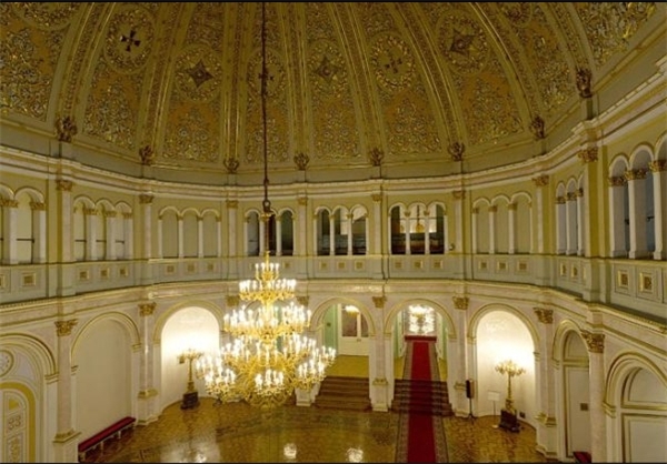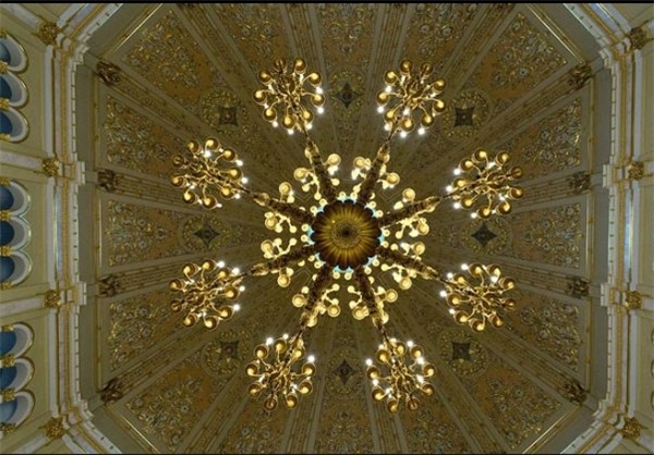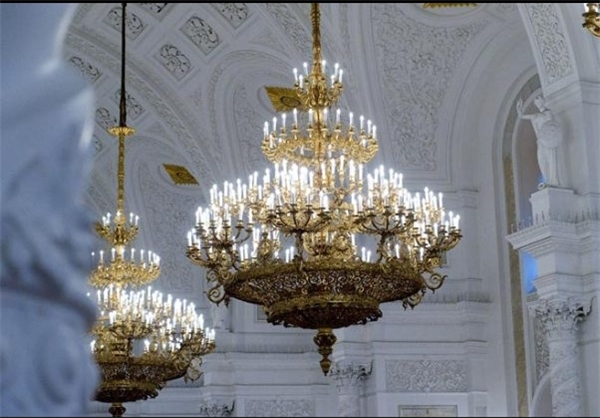 شبها لوسترهای طلایی رنگ نقشدار که هر یک از آنها 1300 کیلوگرم وزن دارد، نور تالارها را تأمین میکنند.