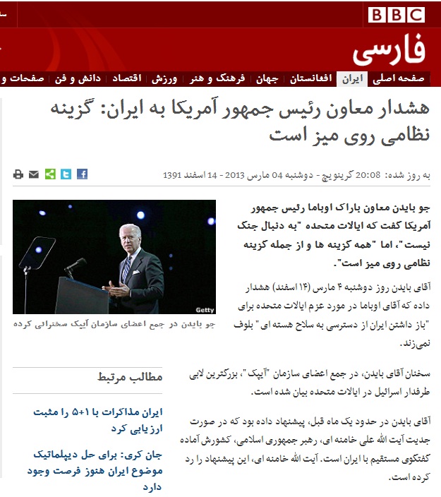 به گزارش"بی بی سی" ارگان رسمی دولت انگلیس،: آقای بایدن روز دوشنبه ۴ مارس (۱۴ اسفند) هشدار داده که آقای اوباما در مورد عزم ایالات متحده برای "باز داشتن ایران از دسترسی به سلاح هسته ای" بلوف نمیزند.