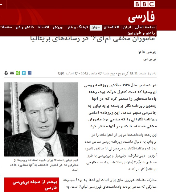 جام سیاسی: "بی بی سی"ارگان رسمی دولت انگلیس، در یادداشتی با عنوان "ماموران مخفی امآی۶ در رسانههای بریتانیا" به قلم "جرمی دانز" می نویسد: در دسامبر سال ۱۹۶۸ میلادی روزنامه روسی "ایزوستیا" که تحت کنترل دولت بود، رشته یادداشتهایی را منتشر کرد که در آنها چندین روزنامهنگار برجسته بریتانیایی به جاسوسی متهم شدند. این روزنامه اسامی روزنامهنگارانی را که مدعی بود ماموران مخفی هستند، با کد رمز آنها منتشر کرد.