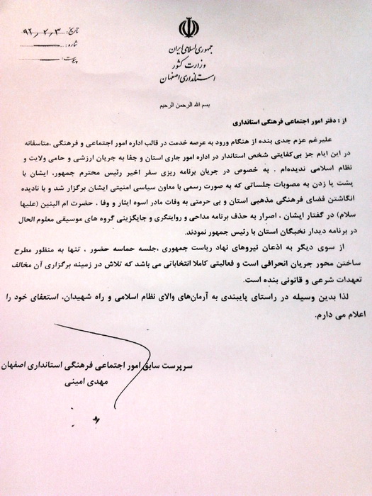برابر اخبار دريافتي از اصفهان، سرپرست امور اجتماعی فرهنگی استانداری اصفهان در پی فشارهاي وارده مبنی بر استفاده از گروه موسیقی به جای مداحی و روایتگری از شهدا در روز وفات حضرت ام البنین (علیها سلام) و همچنین اصرار و فشار اوردن چند تن از افراد نهاد ریاست جمهوری مبنی بر گنجاندن زمانی برای سخنرانی اقای مشایی در جلسه دیدار رییس جمهور بانخبگان اصفهان استعفاء داد.
