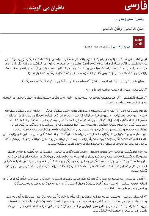 شبکه بی بی سی فارسی (bbcpershian) بنگاه خبرپراکنی دولت انگلیس، از جمله این رسانه هاست که در ادامه سیاست های خصمانه خود علیه ملت ایران و نظام جمهوری اسلامی، در اخبار و تحلیل های خود به طور رسمی و علنی دست آقای هاشمی رفسنجانی را به عنوان پیروز انتخابات بالا برده و از هم اکنون القاء می کند که در صورت پیروزی فردی غیر از هاشمی "تقلب شده و باید منتظر رخدادهای خشونتبار و احتمالاً براندازی خونبار به جای توسعه سیاسی باشیم."