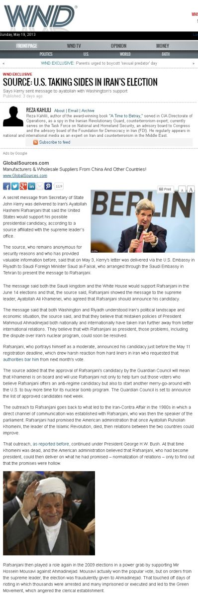 جام بین الملل: سایت دبلیو ان دی WND ادعا کرد که یکی از منابع آمریکایی که به دلایل امنیتی نخواسته است نامش فاش شود گفته است که جان کری وزیر امور خارجه آمریکا در پیام محرمانه به هاشمی رفسنجانی اطلاع داده است که دولت آمریکا از کاندیداتوری او حمایت خواهد کرد.