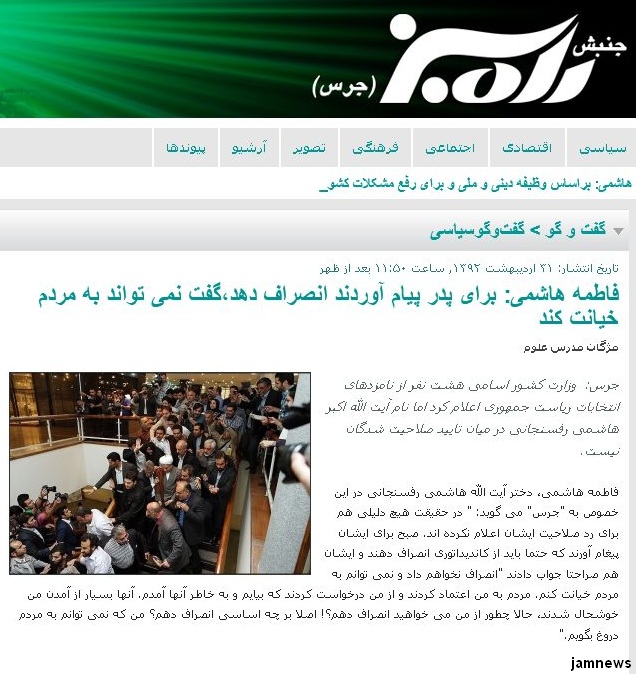 فاطمه هاشمی، دختر آقای هاشمی رفسنجانی در خصوص عدم احراز صلاحیت آقای هاشمی رفسنجانی به سایت "جرس" گفت: «در حقیقت هیچ دلیلی هم برای رد صلاحیت ایشان اعلام نکرده اند.»