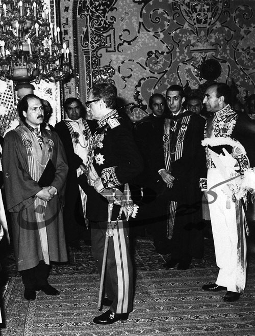 «سیدحسین نصر» (از شاگردان فرای و کیسینجر/ نفر اول از چپ) صبح 3 بهمن 1351 با لباس تشریفاتی سلطنتی در مراسم «سلام عید غدیر» در حضور «محمدرضا پهلوی». «اسدالله علم» (وزیر دربار/ نفر اول از راست) نیز در عکس دیده میشود.
