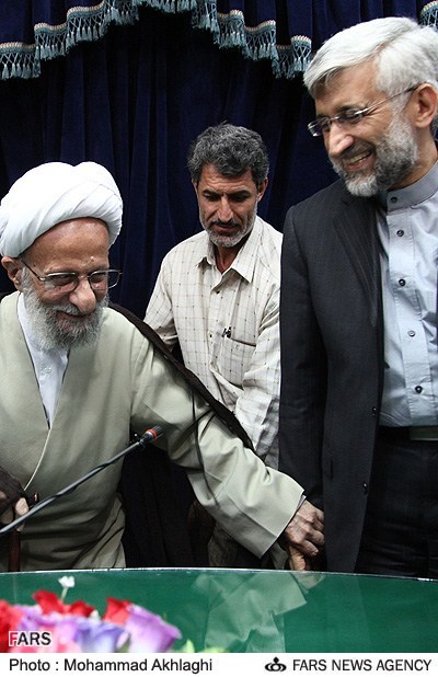 دکتر سعید جلیلی کاندیدای یازدهمین دوره ریاست جمهوری دقایقی پیش با علامه مصباح دیدار کردند که از نکات بارز این دیدار، استقبال ویژه علامه مصباح یزدی از دکتر جلیلی بود.