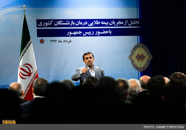 احمدینژاد در بخش دیگری از سخنان خود با مورد توجه قراردادن بیمه طلایی درمان اظهار کرد: این بیمه خدمت و هدیهای به جامعه عزیز پیشکسوت، کارآزموده و بزرگمان است و انشاءالله روزی برسد که کسی به خاطر درمانش مستاصل نشود. به هرترتیب دستهایی از بیرون و داخل گره خوردهاند و مشکلاتی برای ما ایجاد کردهاند، اما ما مطمئنیم که ملت ایران از این موانع عبور خواهد کرد و اصلا سیل ملت ایران همه موانع را برخواهد داشت.