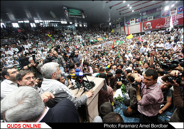در حلقه هزاران حامي دکتر سعید جلیلی در مشهد اقشار مختلف مردم نظیر دانشجویان، طلاب، استادان، جوانان و دختران و مشاهده ميشدند كه با فریاد «نه سازش نه تسلیم؛ یار جلیلی هستیم»، «شهید زنده، ما برگ برنده ما»، «خامنه ای زنده باد؛ جلیلی پاینده باد»، «زنده باد جلیلی»، «دوستت داریم جلیلی»، «مرگ بر آمریکا» و «دیالمه زنده است؛ جلیلی پاینده است» نسبت به مرد مقاومت ابراز احساسات ميكردند.