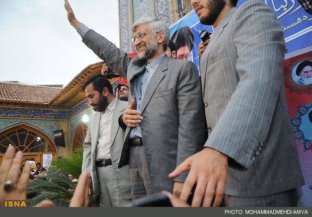 حامیان جلیلی شعارهایی همچون "آمریکا در چه فکریه؟، رییسجمهور جلیلیه"، "دشمن شده بیچاره، جلیلی رای میاره"، "این همه لشکر آمده به عشق رهبر آمده" و... سر میدادند.