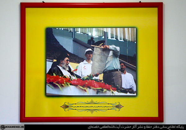 سال ۱۳۷۶ یك جشنوارهی بزرگداشت دفاع مقدس برگزار كردیم كه پنج هزار جانباز شركت كردند. یك نامه هم نوشتیم و از رهبری دعوت كردیم كه در این مراسم حضور داشته باشند. آقا پذیرفتند و آمدند. این عكس هم مربوط به بازكردن رمز مسابقات است. مراسم بسیار زیبایی بود. دوستان میگفتند كه ما هم گریه كردیم و هم خندیدیم. هم زهرهترك شدیم، هم صدقه دادیم تا مراسم خوب برگزار شود. واقعاً هم خوب برگزار شد. جانبازان قطع پا، «راپِل» كار میكردند، حمل مجروح میكردند. طناب را میبریدند و میرفتند آن طناب را میگرفتند. آقا هم خیلی تعریف كردند.