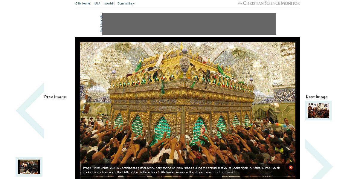 سایت آمریکایی کریستین ساینس مانیتور که یکی از سایت های مهم آمریکایی است در باکس عکس روز خود، به عکسی که عکاس سایت از حرم حضرت عباس علیه السلام گرفته بود پرداخت و در توضیح عکس نوشت: امام دوازدهم شیعیان همچنان زنده است و از نظرها غایب است و شیعیان همچنان در روز تولد آخرین امام خود جشن می گیرند.