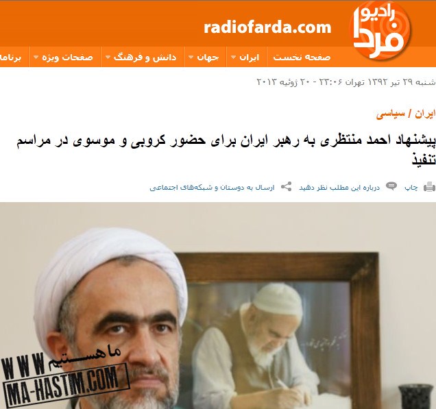 صراط: احمد منتظری فرزند آیت الله منتظری با نگارش نامه ای به رهبر انقلاب در آستانه روی کار آمدن دولت جدید آقای سیدحسن روحانی به ایشان نوشته است که "بهتر است موسوی و کروبی در مراسم تنفیذ حکم ریاست جمهوری شرکت کنند تا نظام نشان دهد رحم،شفقت و لطف را می توان جایگزین سنگ دلی، بی رحمی و انتقام کرد".