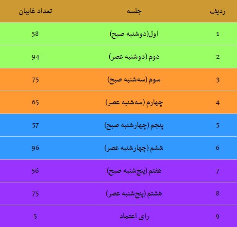 در روز سهشنبه هم که سومین و چهارمین نشست بررسی صلاحیت وزرای پیشنهادی برگزار شد، به ترتیب 75 و 65 نماینده غیبت داشتند.