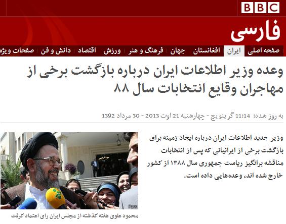 بی بی سی فارسی (BBCPersian) گزارش داد: «وزیر جدید اطلاعات ایران درباره ایجاد زمینه برای بازگشت برخی از ایرانیانی که پس از انتخابات مناقشه برانگیز ریاست جمهوری سال ۱۳۸۸ از کشور خارج شده اند، وعدههایی داده است. "محمود علوی" در پایان جلسه هیأت دولت ایران در روز چهارشنبه ۳۰ مرداد (۲۱ اوت) گفته: ترس بیمورد کسانی که در حوادث ۸۸ خلافی مرتکب نشدند را حل میکنیم.»