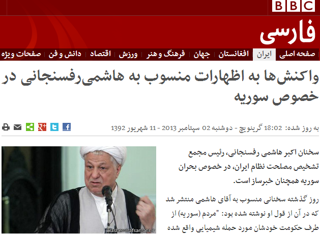 در گزارشی که در این سایت منتشر شده، آمده است: نسخه اولیه اظهارات آقای رفسنجانی تفاوت چشمگیر و قابل توجهی با اظهارات سایر مقامات ایرانی داشت که ادعا کرده بودند شورشیانی که برای سرنگونی دولت بشار اسد تلاش می کنند، مسئول استفاده از سلاح های شیمیایی هستند.