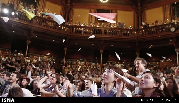 سنت رویداد جایزه ایگ نوبل که به سمت سکو موشکهای کاغذی پرتاب میشود