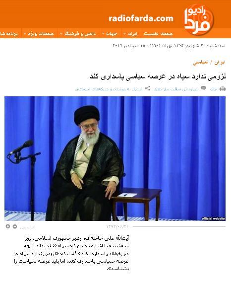 وب سایت رادیو فردا(radiofarda) وابسته به سازمان اطلاعات و امنیت آمریکا (سیا) عمده گزارش خود از بیانات رهبری را به موضوع "سپاه و سیاست" اختصاص داد.
