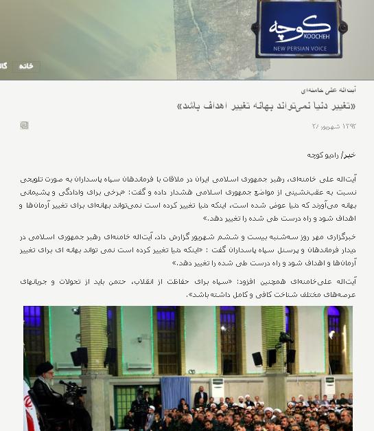 سایت رادیو کوچه(radiokoocheh) نیز در این باره نوشت: آیتالله علی خامنهای، رهبر جمهوری اسلامی ایران در ملاقات با فرماندهان سپاه پاسداران به صورت تلویحی نسبت به عقبنشینی از مواضع جمهوری اسلامی هشدار داده و گفت: «برخی برای وادادگی و پشیمانی بهانه میآورند که دنیا عوض شده است، اینکه دنیا تغییر کرده است نمیتواند بهانهای برای تغییر آرمانها و اهداف شود و راه درست طی شده را تغییر دهد.»
