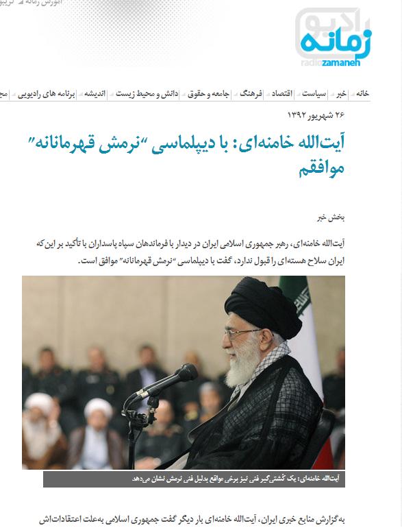 رهبر ایران گفته: "من مخالف حركتهای صحیح دیپلماسی نیستم، بنده معتقدم به همان چیزی كه سالها پیش نامگذاری شد به نرمش قهرمانانه."»