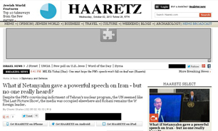 به گزارش سرويس بين الملل باشگاه خبرنگاران، روزنامه صهيونيستي هاآرتص در شماره امروز(چهارشنبه) خود گزارشي از سخنراني ضد ايراني نتانياهو نخست وزير رژيم صهيونيستي در سازمان ملل و فضاي حاكم بر آن منتشر كرد. در اين گزارش كه به قلم «چمي شالوو» نوشته شده، نويسنده هر چند در ابتدا تلاش كرده با چاپلوسي از سخنراني نتانياهو در سازمان ملل تمجيد كند اما در ادامه مجبور شده به حقيقتي تلخ نيز اشاره كند.